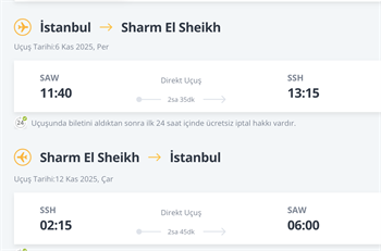 1.Day : Meeting in Sabiha Gokcen Airport International Flight desk encounter at 21:00 for flight check-in. Flight with Pegasusat 00:15 to Sharm El-Sheikh
